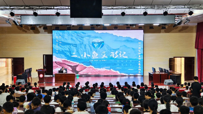 --讲座由市青少年心理健康协会的特聘讲师也是我校的心理老师池静老师主讲,她带领着我校初一年级全体学生进行了一场“鱼跃新海、水漾青春”的心理探索之旅。