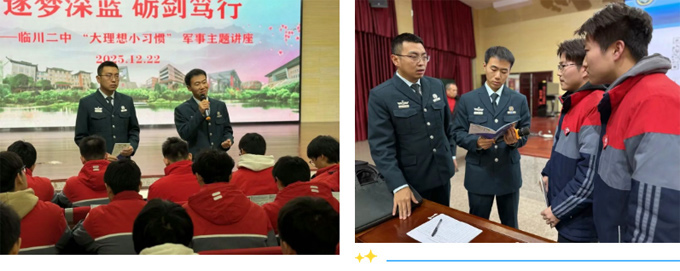 --为厚植学子爱国情怀,助力“军事家”大理想学子筑牢根基,践行“胸怀天下,树大理想;立足自我,育小习惯”,12月22日16:00,临川二中特邀中国人民解放军海军潜艇学院王广大、刘祥臻教员,在玉茗讲堂举办“深海利剑,青春担当”专题军事讲座与交流活动。全校以“军事家”为大理想的学生齐聚一堂,共赴深蓝主题学习交流之约。