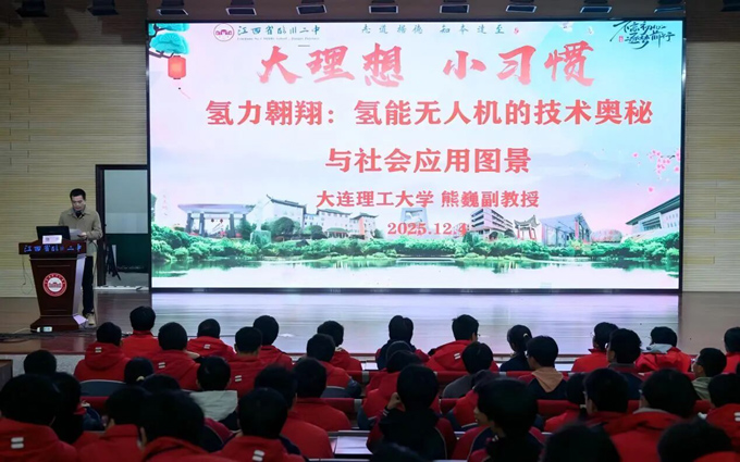 --为拓宽学生科技视野,点燃青少年科学探索热情,践行“大理想,小习惯”育人模式理念,12月4日晚,临川二中特邀“985”“211”高校大连理工大学环境学院熊巍副教授,为310名怀揣“科学家”梦想的高中学生带来了一场主题为“氢力翱翔:氢能无人机的技术奥秘与社会应用图景”的前沿科技讲座。