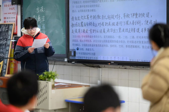 --汪锋民老师的课堂始终聚焦“以生为本”。他从学生真实作答的误区切入,巧妙引导学生转换角色参与评分,在讨论中自主诊断问题、明确标准。教学过程中,他精讲“层层剥离法”与“陈说分解法”,并创编朗朗上口的口诀助力记忆,更注重将句式训练与文言断句、阅读写作能力进行关联迁移,凸显了语言学习服务于综合素养提升的根本宗旨。