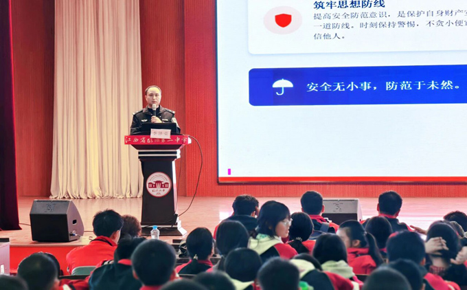 --警校联动,安全宣讲“接地气”。安全周期间,学校专门请来了临川区上顿渡派出所副所长李泽荣,为师生们带来一堂既走心又接地气的安全课。讲堂上,李所长没有照本宣科,而是用一口通俗易懂的大白话,把预防校园欺凌、防溺水、防范新型网络诈骗、禁毒、防火防盗这些看似老生常谈的话题,掰开揉碎了讲。最抓人的,是他信手拈来的那些真实案例——就发生在同学们身边,听着熟悉,细想却让人后背一凉。尤其是针对中学生容易栽跟头的“网络交友陷阱”、“游戏充值诈骗”等,李所长不光点出了常见的套路和特征,还教给大家分享了实实在在的“安全锦囊”。他反复叮嘱,同学们要知法、懂法、守法,遇到危险别慌,要学会拿起法律武器保护自己。一堂宣讲课下来,没有枯燥的说教,只有一个个鲜活的故事和实用的提醒。台下掌声一阵接着一阵,大家纷纷表示,这样的宣讲课,听得进、记得住、用得上。