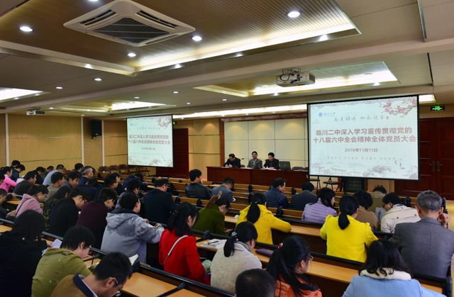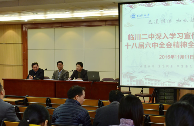 11月11日下午,临川二中党总支在南校区图书馆四楼报告厅召开了全体党员大会,组织全体党员集中学习宣传贯彻党的十八届六中全会精神。学校党总支支委会成员(党总支书记华小明因出席江西省第14次党代会请公假)、160多名在职党员教工参加了会议。会议由学校党总支副书记刘保华同志主持。
